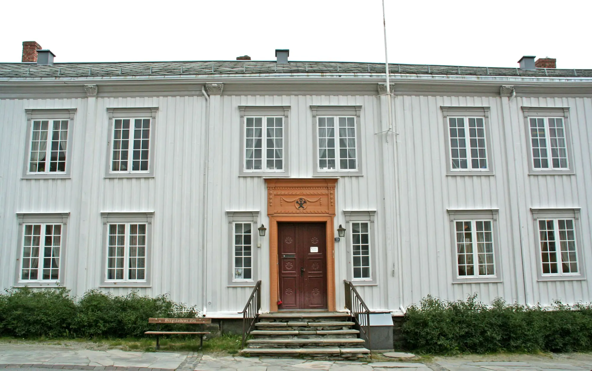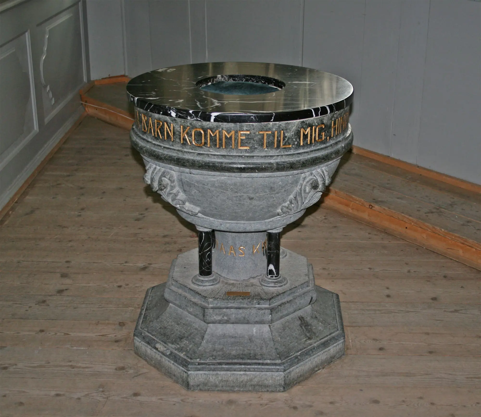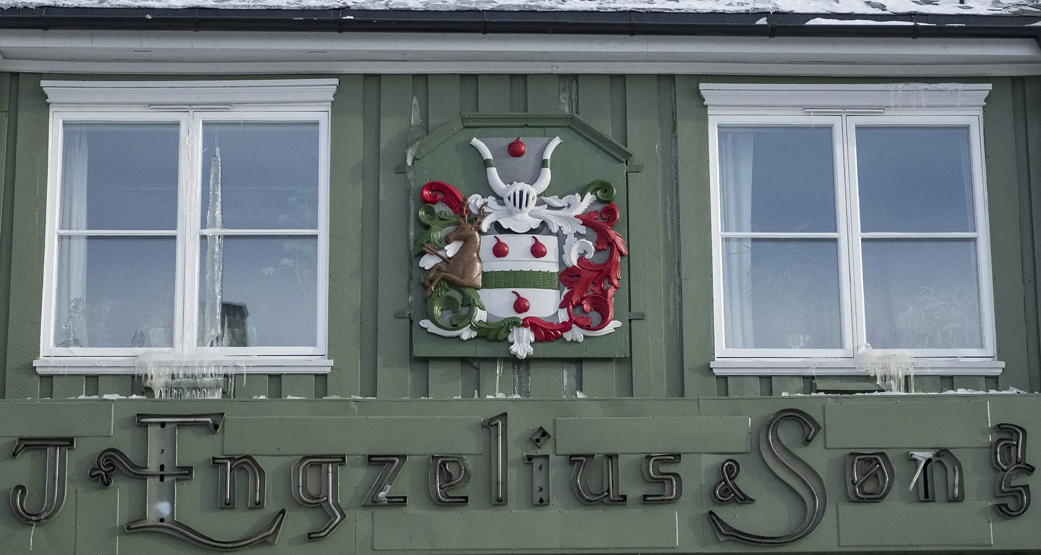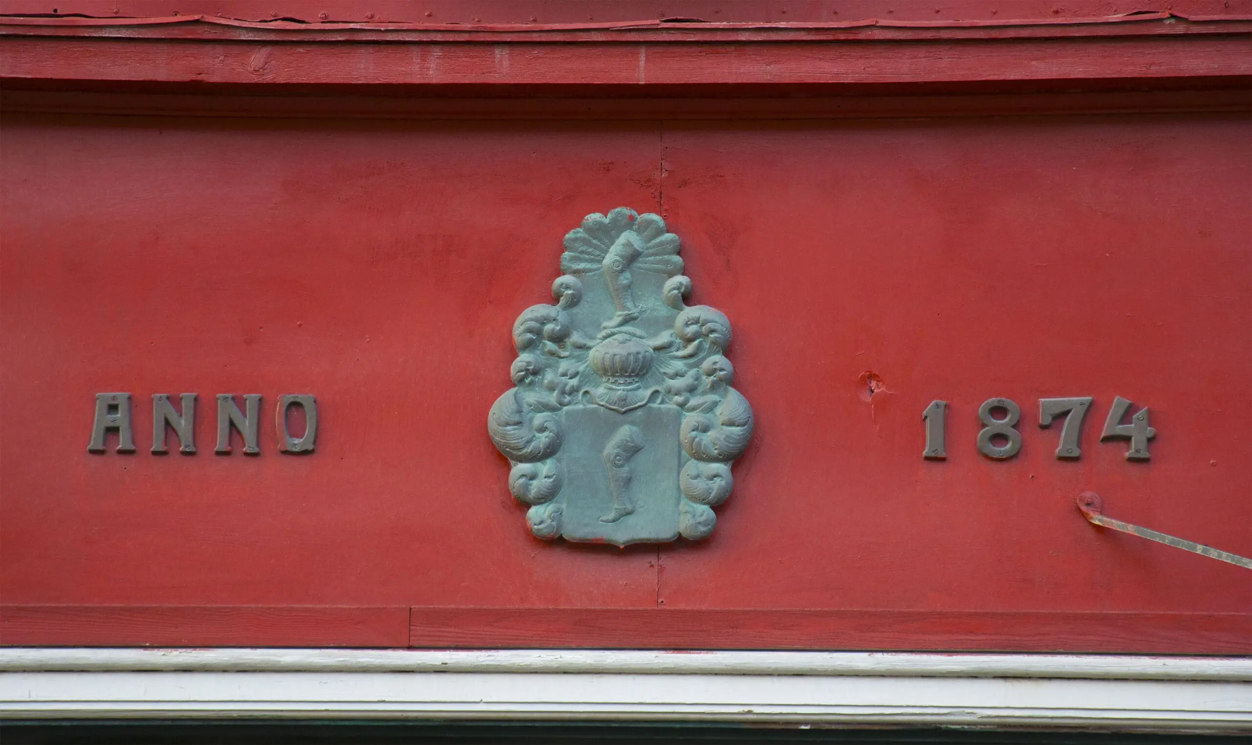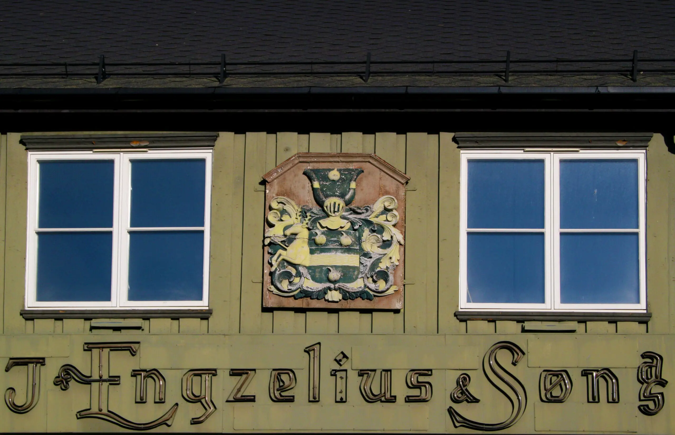 Abildgaard betyr «eple-/frukthage», og på våpenskjoldet finner man hjelm og utskårne epler. Peter Abildgaard var gift med søster av verksdirektør Peder Hiort, og det kan være forklaringen på at skjoldet også har et hjortehode. Dette bildet viser våpenskjoldet etter restaureringen i 2017.