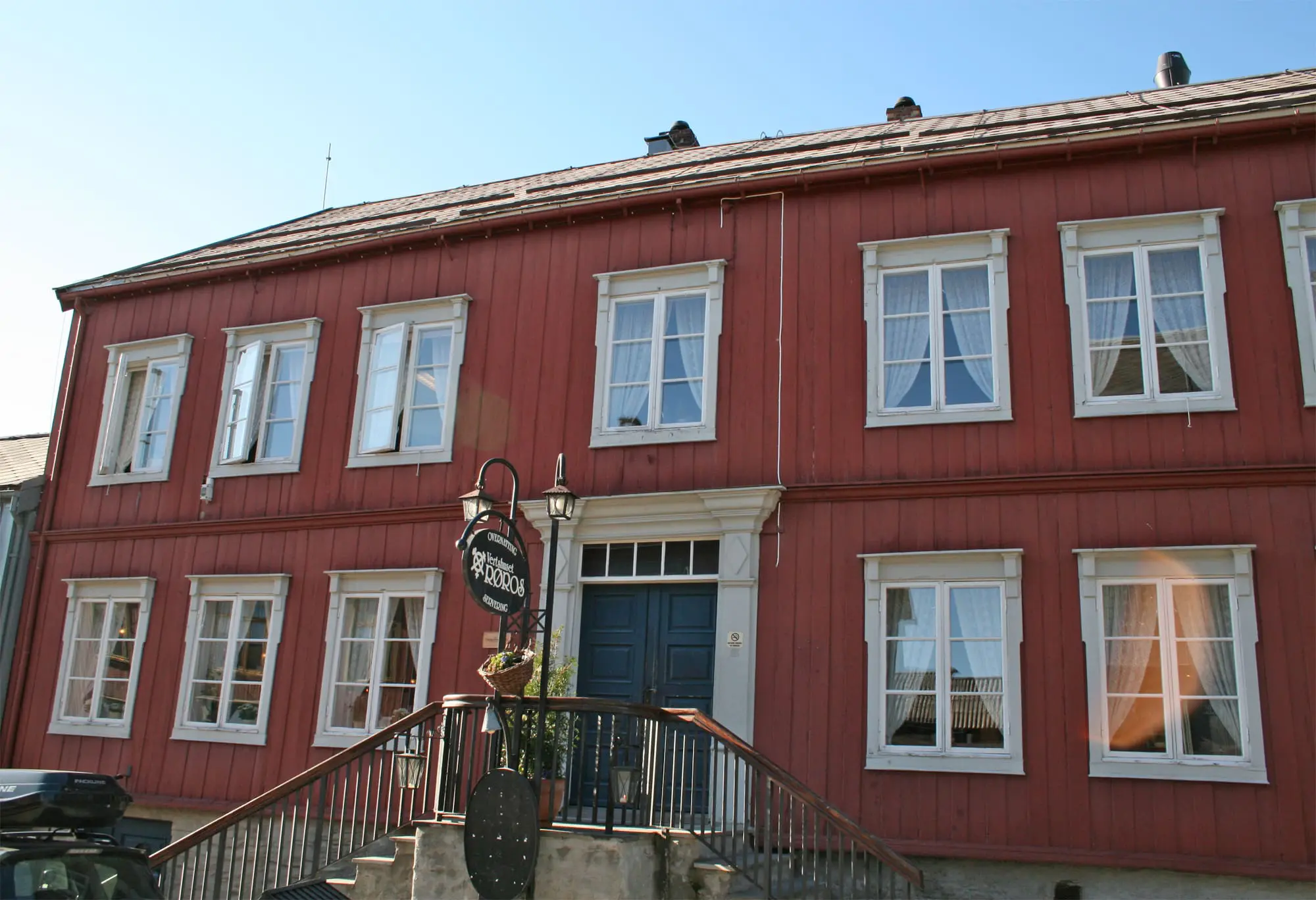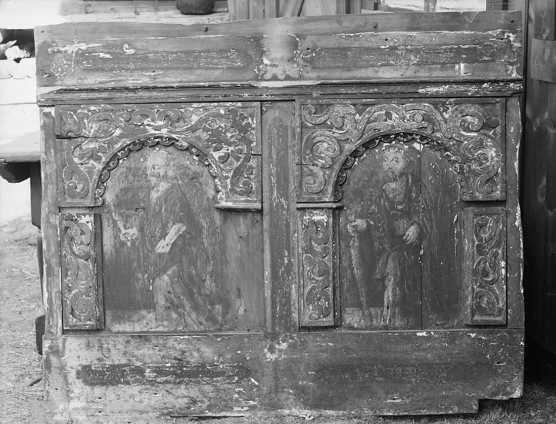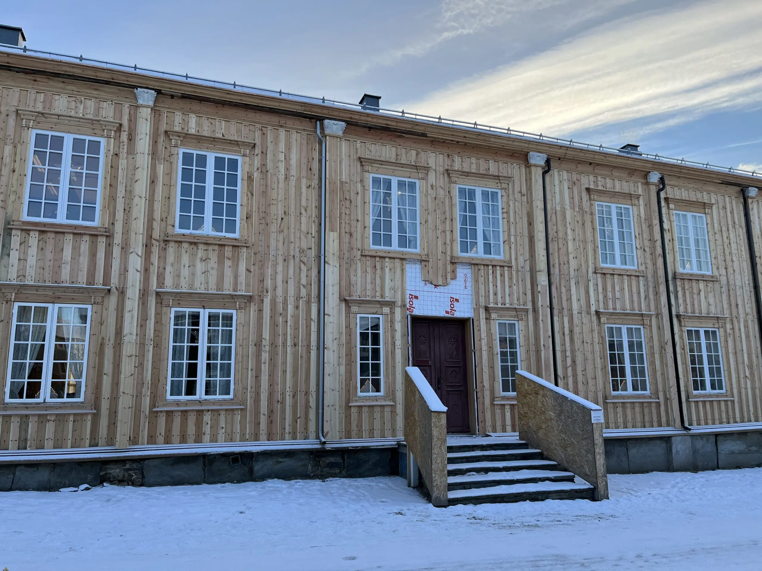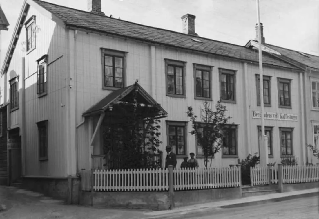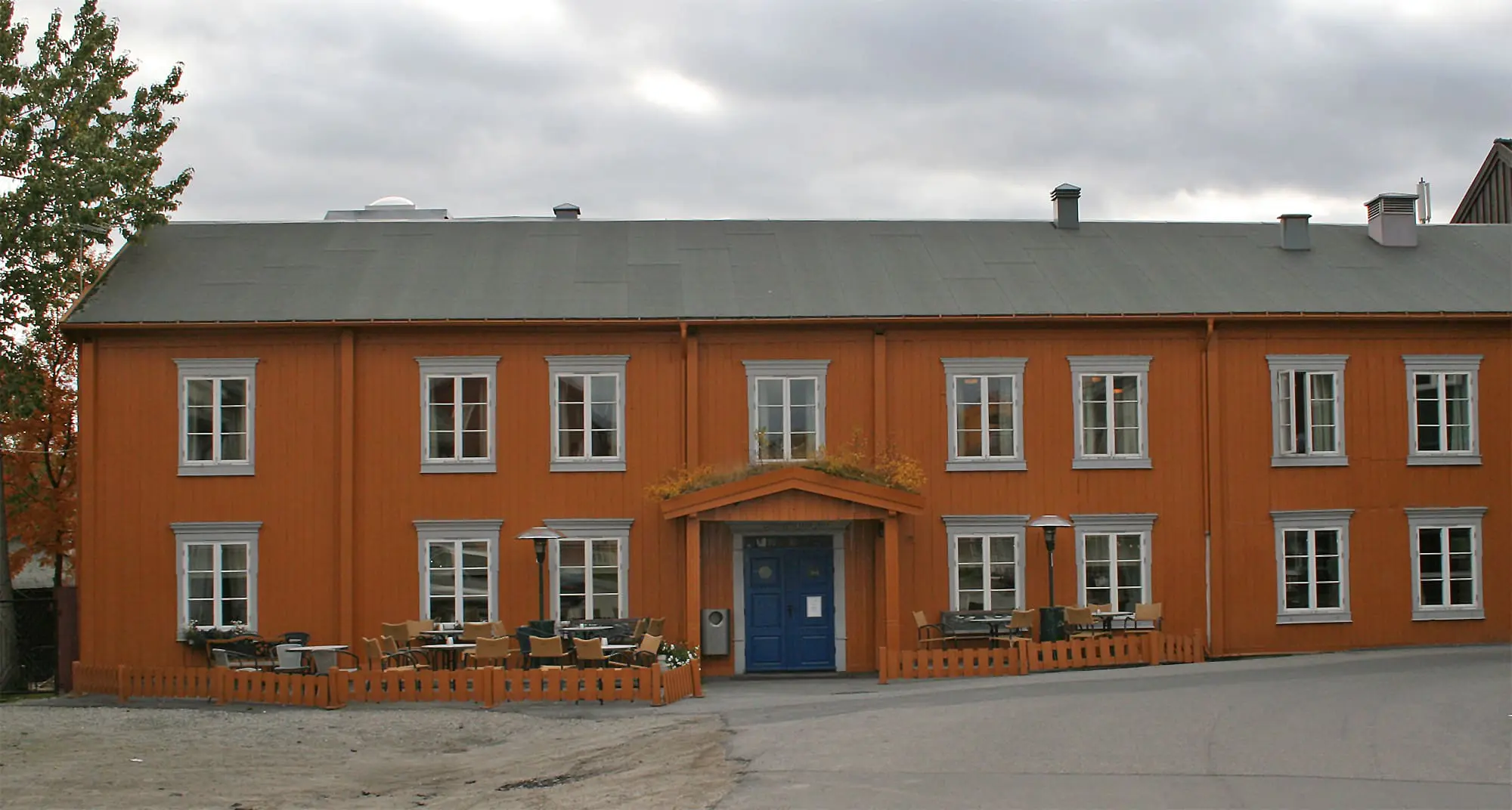 Abildgaard betyr «eple-/frukthage», og på våpenskjoldet finner man hjelm og utskårne epler. Peter Abildgaard var gift med søster av verksdirektør Peder Hiort, og det kan være forklaringen på at skjoldet også har et hjortehode. Dette bildet viser våpenskjoldet etter restaureringen i 2017.
