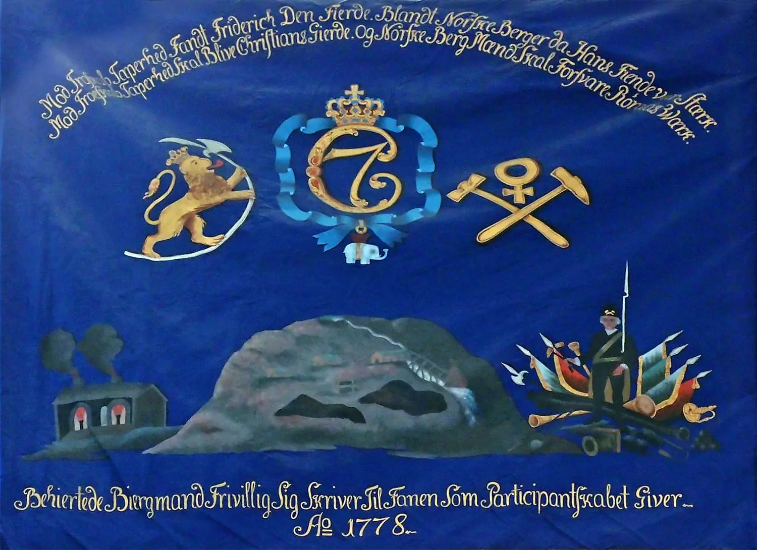 Fanen til gruvearbeiderne. Den opprinnelige fanen til Bergkorpset ble anskaffet i 1778. Her vises Christian VIIs emblem, kobberverkets merke og riksløven, i tillegg til berget med malmforekomstene, en smeltehytte og en soldat.